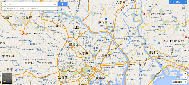 | 自宅のある東京都荒川区を中心に「ハードオフ」と検索。かなり遠出をしないとないことがわかる。 |