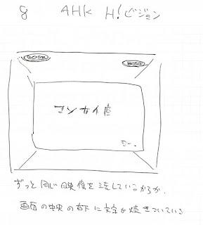 2フロア目に降りて一番最初に目に飛び込んでくるのがAHK H!ビジョンという展示。 テレビで架空の花火大会の様子を流すというもので、その花火の形が猥褻な形状をしているだけという反応の難しい展示だ。