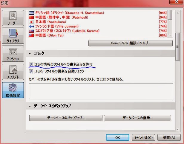ついでに、 「拡張設定」タブの「コミック情報のファイルへの書き込みを許可」と「コミックファイルの更新を自動チェック」にチェックを入れておいてください。