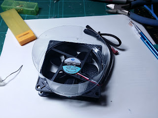 こんな感じで天板を抜いて高さも減らしたクリスタルボックスにファンをはりつける。こういう時にはとりあえず「ウルトラ多用途」を使えばなんとかなる。※