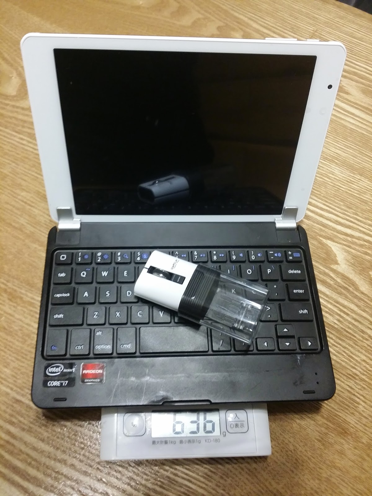 キーボードとマウスを載せてもこの軽さ。週刊青年漫画(ヤングなになに系)がほぼ同じ重さらしい。